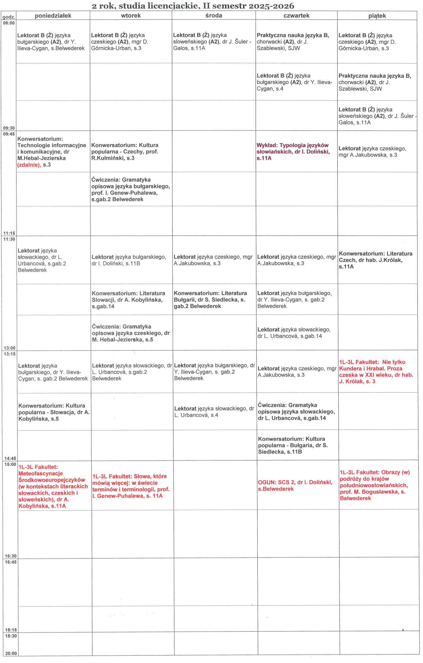 Plan zajęć 2025/2026, semestr zimowy